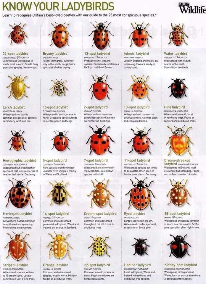 👉 "Tipi di coccinelle. Mangiano gli afidi, le mosche bianche e altre piaghe. Sono molto sensibili al degrado ambientale. Vederle è segno di salute dell'ambiente."